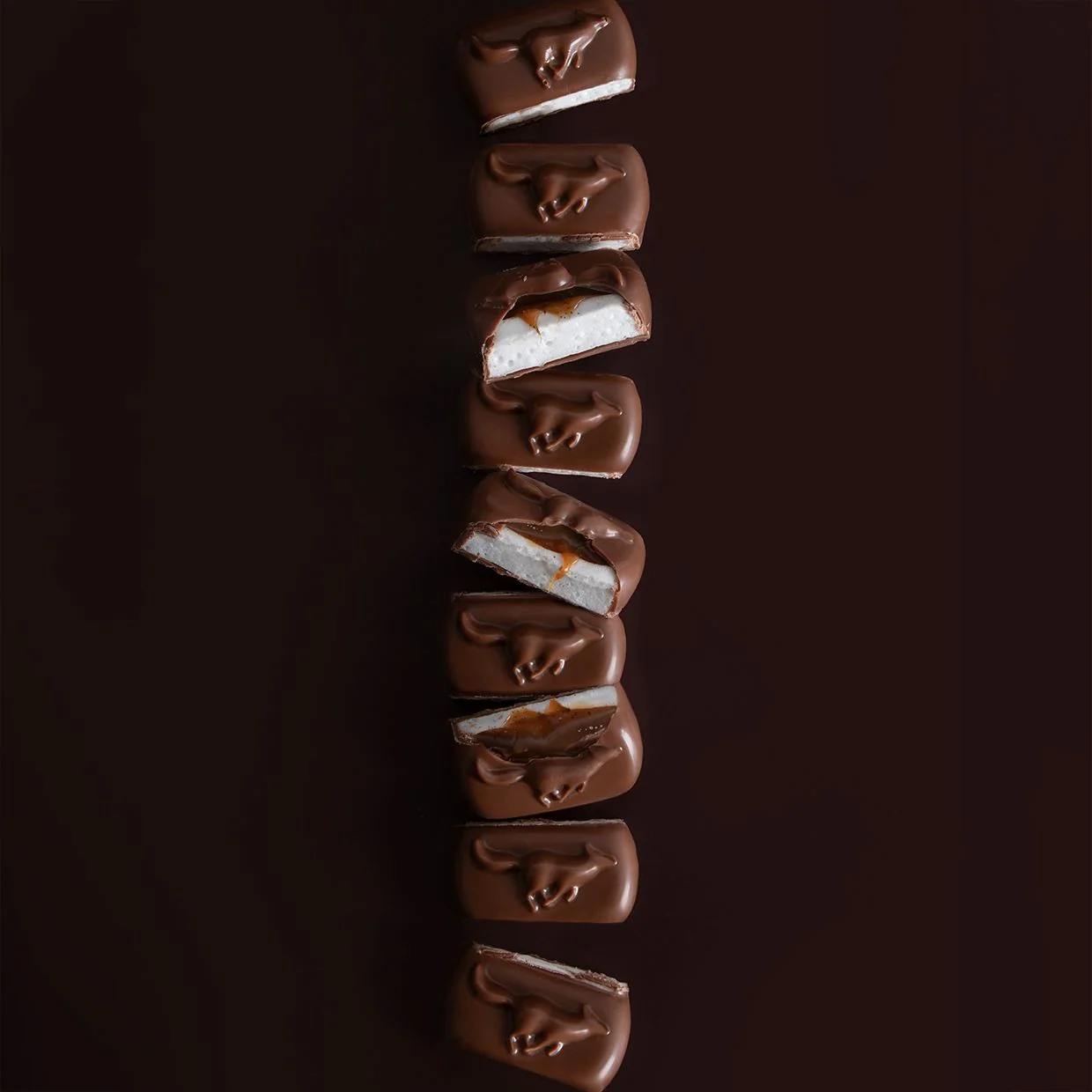 Guimauve enrobée de chocolat au lait avec insert caramel.